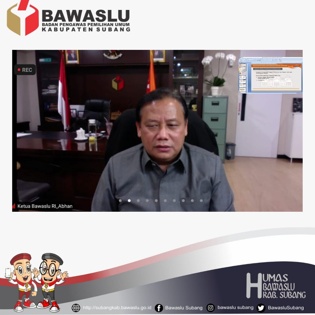 Pada webinar kali ini narasumber diisi oleh Prof. Dr. Fauzan Ali Rasyid, M.Si. turut hadir dalam acara tersebut Pimpinan Bawaslu Jawa Barat, Sutarno dan Pimpinan Bawaslu Kabupaten/Kota se Jawa Barat.