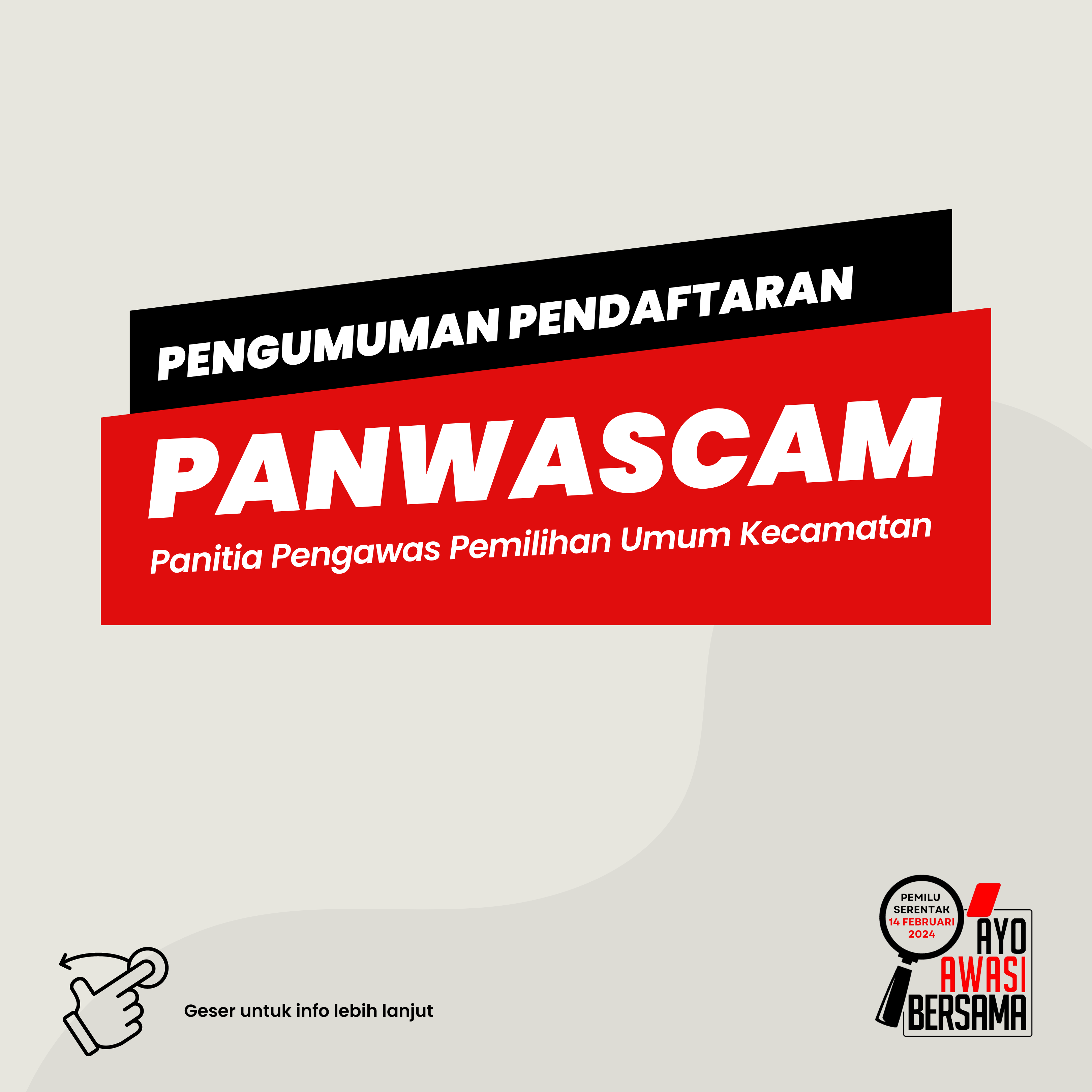 Dalam rangka pembentukan Panwaslu Kecamatan dalam Pemilu Serentak tahun 2024, Kelompok Kerja Pembentukan Panwaslu Kecamatan Kabupaten Subang berdasarkan Peraturan Badan Pengawas Pemilihan Republik Indonesia Nomor 19 Tahun 2017 sebagaimana diubah terakhir dengan Peraturan Badan Pengawas Pemilihan Umum Republik Indonesia Nomor 8 Tahun 2019, atas kewenangan yang diberikan oleh Undang-Undang Nomor 7 Tahun 2017, membuka kesempatan bagi Warga Negara Indonesia yang memenuhi persyaratan untuk mendaftarkan diri sebagai calon anggota Panwaslu Kecamatan.