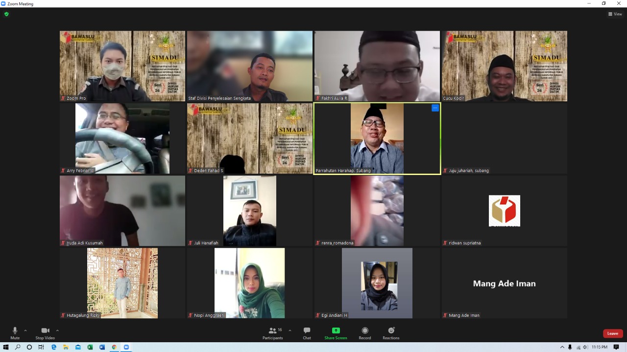 senin,30/8/2021. Ketua, Anggota dan Jajaran Sekretariat Bawaslu Kabupaten Subang telah melaksanakan kegiatan Serial Peningkatan Kapasitas Individu (SIMADU) seri ke-26 dengan tema "Persiapan evaluasi dan pemeringkatan penerapan keterbukaan informasi publik Bawaslu Kabupaten Subang tahun 2021" melalui aplikasi zoom (Online) di sekretariat Jl. Palabuan No. 9 Kel. Sukamelang
