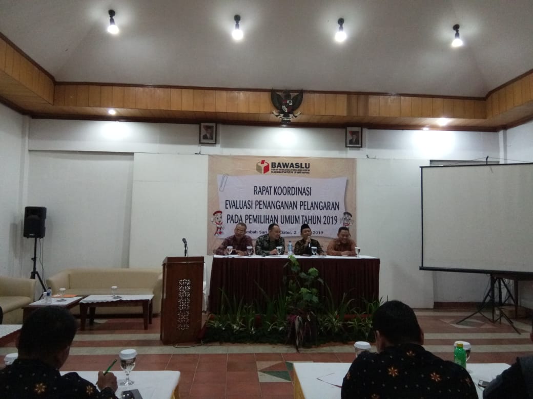 Subang. BAWASLU KABUPATEN SUBANG. Anggota Bawaslu Provinsi Jawa Barat Julianto dan Kepala Sekretariat Bawaslu Provinsi Jawa Barat Eliazar Barus yang didampingi oleh Ketua dan Anggota Bawaslu Kabupaten Subang memberikan materi serta arahan kepada Panwascam Se-Kabupaten Subang dalam rangka Rapat Koordinasi Evaluasi Penanganan Pelanggaran Pada Pemilihan Umum Tahun 2019 yang dilaksanakan pada tanggal 2-3 Juni 2019 bertempat di Hotel Lembah Sari Mas Ciater Subang.