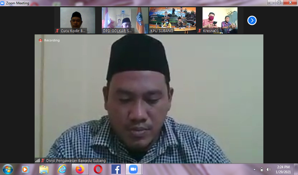 SUBANG - Jumat, 29 Januari 2021, Ketua beserta anggota Bawaslu Kabupaten Subang melakukan pengawasan dalam rangka menghadiri undangan Rapat Pleno Rekapitulasi Pemutakhiran Daftar Pemilih Berkelanjutan (DPB) Tahun 2021 periode bulan Januari Tingkat Kabupaten Subang yang dilaksanakan oleh KPU Kabupaten Subang. Rapat Pleno diselenggarakan melalui Video Confrence via Aplikasi Zoom.