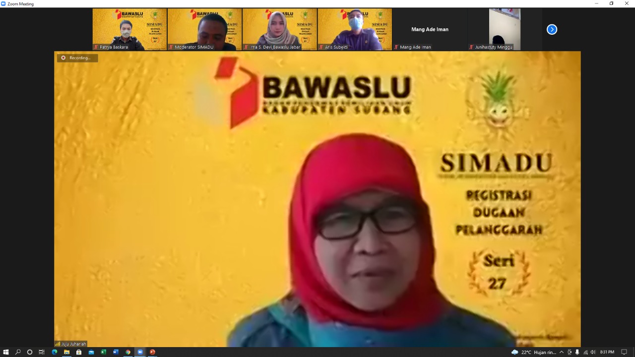 Senin,6/9/2021. Bawaslu Kabupaten Subang melalui Divisi Penanganan Pelanggaran kembali menyelenggarakan kegiatan SIMADU seri ke - 27 dengan tema Registrasi Dugaan Pelanggaran. Kegiatan tersebut dilaksanakan secara Daring melalui aplikasi ZOOM, yang dihadiri oleh 22 Orang Peserta, dan beberapa diantaranya melaksanakan kegiatan di Sekretariat Bawaslu Kabupaten Subang, Jalan Veteran No. 9 Subang.