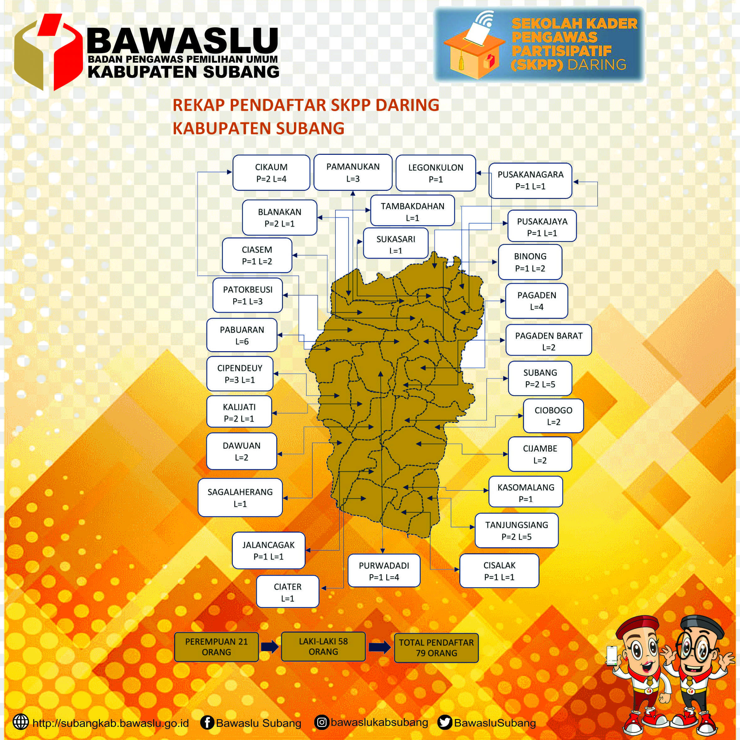 Subang(16/04/20). Minat dan Antusiasme Masyarakat Jawa Barat terhadap Sekolah Kader Pengawasan Partisipatif Daring yang diselenggarakan oleh Badan Pengawas Pemilu Sangat baik, dibuktikan dengan paling banyaknya jumlah pendaftar dari Provinsi Jawa Barat, begitu juga dengan jumlah pendaftar dari Kabupaten Subang. Setelah dilakukan rekap terhadap pendaftar Sekolah Kader Pengawasan Pertisipatif Daring dari Kabupaten Subang, tercatat ada 79 orang pendaftar yang berasal dari dua puluh tujuh kecamatan dari tiga puluh kecamatan yang ada di Kabupaten Subang, dengan pendaftar laki-laki sebanyak 58 orang dan pendaftar perempuan sebanyak 21 orang.